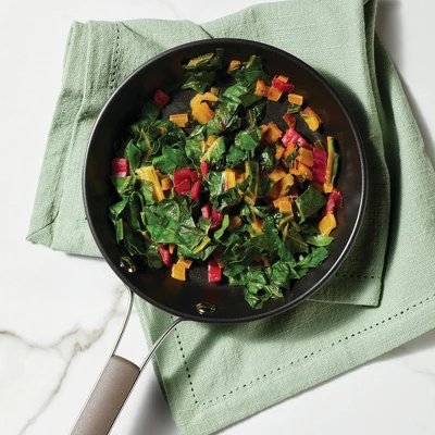 Make a quick batch of fluffy scrambled eggs or Ayesha’s Easy Pan Steaks with this versatile nonstick kitchen skillet from the Ayesha Curry Hard Anodized Collection. Designed for practical performance with a stylish touch, this small nonstick frying pan features thicker gauge, hard anodized aluminum construction for fast, even heat and extra durability to match the pace of busy, modern kitchens. A sleek, versatile design pays special attention to the details that make cooking feel less like work like a triple-layer premium nonstick surface for foods that glide off the pan with ease and an extra nonstick exterior finish to make cleanup a breeze. Sleek, stainless steel and silicone handles give a secure, comfortable hold, and because oven-to-table versatility and convenience is a must, this hard anodized nonstick cookware is oven safe to 400 degrees! Make some memories and bring the family together for great meals made easier with the Ayesha Curry Hard Anodized Nonstick Frying Pan.