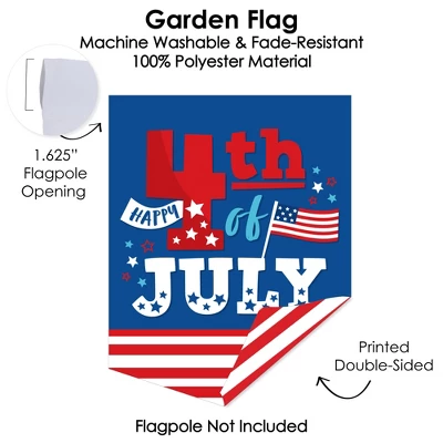 Firecracker 4th of July Garden Flag INCLUDES 1 polyester fabric material garden flag in a vertical pennant shape that measures 12 inches wide and 15.25 inches tall. (Flagpole Not Included) Cute Decor: Welcome houseguests with this weather resistant Americana Party Garden Flag. Printed double-sided, Firecracker 4th of July – Fourth of July Decor Garden Flag looks great placed close to your home, added to flowerpots, or displayed next to your favorite garden gnome decoration. Yard & Home: Firecracker 4th of July Garden Flag is machine washable and fade-resistant, allowing you to easily display in your outdoor lawn or inside your home for a fun Fourth of July decoration. The small and cute size helps make this a great housewarming gift for a loved one’s deck, patio, porch, or yard. High-Quality Supply: Firecracker 4th of July Garden Flag is professionally printed double-sided on 100% polyester material. With a 1.625-inch flagpole opening, easily & quickly display the vibrant Patriotic Red, White, and Blue Party Garden Flag. Please Note: Flagpole Not Included – will fit most standard-sized garden flag stand flagpoles. Printed In The USA: Firecracker 4th of July outdoor lawn and home Garden Flag is designed and manufactured at our Wisconsin facility using materials that are Printed in the USA – Fabric Flag Made in China.