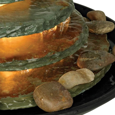 Make your living spaces come alive with this soothing lighted tabletop water fountain. Water falls from level to level, spilling onto pebbles below. A Zen fountain designed for a sense of calm and serenity.