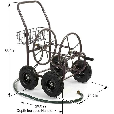 Store your hose away while you’re on the go with this Liberty Garden 871 4 Wheel 250 Foot Steel Frame Water Hose Reel Cart. Made of weather-resistant powder-coated 13-gauge steel, this cart is built to last. It holds 250 feet of 0.63-inch standard vinyl hose so it’s easy to store away and roll around. The 90-degree brass swivel connector makes it easy to turn the reel with the non-slip handle grip. With 4 8-inch pneumatic tires, maneuverability around the garden is a breeze. The attached storage basket will hold all your other garden accessories with ease. No need to walk across your whole garden to grab your gloves or hoe. Designed for home, farm, and commercial uses the Liberty Garden 871 4 Wheel 250 Foot Steel Frame Water Hose Reel Cart is endlessly versatile.