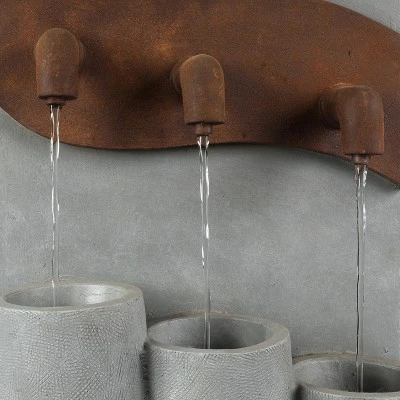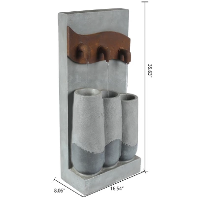 You can relax with this fountain as your focal point to your outdoor living area. The modern-style fountain features three spigots pouring water into stone finish pots. The deep rich bronze color of the water faucets is a beautiful contrast to the gray stone-like finish wall and base of the patio fountain. Made of sturdy cement, this fountain is perfect for outdoors. The fountain can be placed on your deck or patio space, and will be an impressive addition to your outdoor space. Electrical pump is included. The fountain also features a LED light that is powered by the electrical pump.