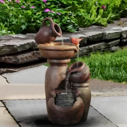 Turn your outdoor space into a tranquil oasis with this artistic tiered fountain. The stately outdoor fountain features four staggered wide-mouth fluted columns. The neutral gray tones of the fountain lends itself as the perfect complement to a natural design. It is crafted from poly resin material, so it is ready for displaying outdoors in your garden, on your deck, porch, or patio. Relax as the water gently cascades from one fluted column to the next. The electric pump is included, and has an adjustable flow rate that allows you to set the water flow to your preference.