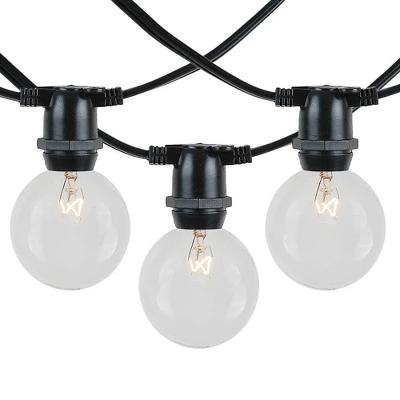 Novelty Lights clear G50 intermediate base bulbs string light set with 25 bulbs on 25′ of commerical grade black wire. These are our most durable string light sets and are suitable for year round outdoor use and permanent lighting applications. Each set includes 25 G50 intermediate base bulbs on a commerical grade black wire stringer with 25 sockets that are spaced 12″ apart. These clear G50 light strings have long-lasting 3,000 hour bulbs and are on a heavy duty 16 gauge SPT-2 black wire stringer. Each socket is made with PVC plastic to provide a water-tight seal and to ensure no defects due to weather. These durable and heavy duty light strings will provide you with years of maintenance free use. Perfect to use on any patio, restaurant, backyard, pergola, wedding venue, or town square for hanging outdoor string lights.