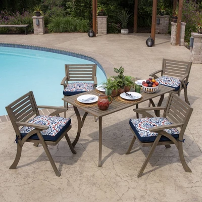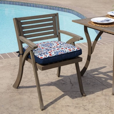 The Arden Selections Plush BlowFill Collection pairs soft polyfiber fill with long-lasting outdoor polyester fabric to create an ultra-comfortable outdoor patio dining cushion. This Clark Blue outdoor dining seat cushion has the following dimensions: 20 in L x 20 in W x 5 in T. The 100% printed polyester outdoor fabric features high UV pigments to protect from ultraviolet rays and resist fading, so your outdoor dining cushion looks vibrant for longer. Water protection helps your patio dining cushion withstand continued outdoor use, while easy cleaning with just soap and water ensures upkeep is low maintenance. Two sets of ties secure the patio dining cushion firmly in place, while a button adds a decorative touch. Inside this patio dining cushion is 100% polyfiber blowfill to help it retain shape and provide long-lasting comfort during outdoor use. Made from 100% recycled plastic bottles, the polyfiber fill provides an environmentally friendly and durable option for your backyard patio. Although this outdoor dining cushion is both water and UV-resistant, we recommend bringing it indoors when it rains or when not in use to preserve its lifespan and keep it looking beautiful.