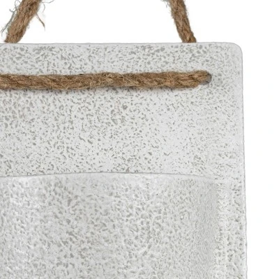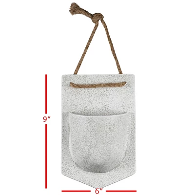 Add a touch of bohemian flair to your wall with this fun and textural wall pocket. The cement-like white finish of this wall pot is washed over with gray to enhance the texture. The thick jute rope hanger brings a soft and rustic warmth to complement the wall planter. Add your favorite single flower or a bit of faux greenery for a decorative accent.