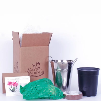 Hippeastrum (commonly known as Amaryllis) are popular for their indoor holiday color and are often given as gifts from October through January. They are easy to grow and are impressive flowers. Their large blossoms can measure up to 8″ across. We only ship one large blooming bulb size to ensure well-proportioned plants, which are guaranteed to produce large, vibrant blooms for you. As bulbs are essentially storage mechanisms, they already contain everything needed to produce flowers. They are tropical and subtropical. All you will need to do is plant them and water. But best of all, they can be induced to re-bloom indoors for years to come. This Specialty Amaryllis kit comes with everything you need to grow this exotic plant: one large Gervase Amaryllis bulb, a 5″ x 7″ trendy, shiny, polished, stainless steel-like, metal, artisan decorative outer planter, a 5″ nursery pot, planting medium, and a set of growing instructions. As bulbs are essentially storage mechanisms, they already contain everything needed to produce flowers.