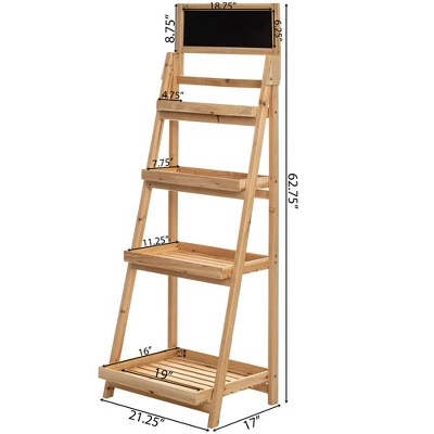 - PERFECT SIZING: The 4-tier shelf offers ample storage and display space with perfect sizing. The bottom shelf is 16 inches long, the bottom center shelf is 11.25 inches long, the center top shelf is 7.75 inches long, and the top shelf is 4.75 inches long. Each shelf is 19 inches wide, and there is an 18.75-inch-wide chalkboard. The shelf is made with top-quality materials for a better decorative appearance