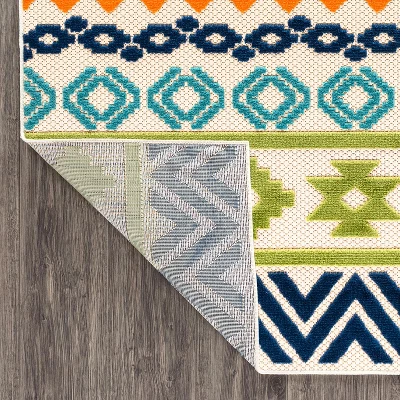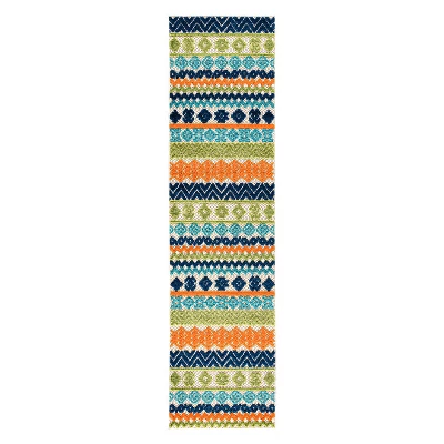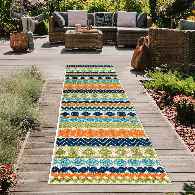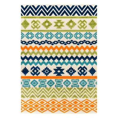 Unroll this mesmerizing rug in or out of your home. The geometric design accompanies sleek bohemian pattern and vivid colors. The durable pile height allows it to be cleaned quickly and effectively. Made with 100% polypropylene fibers, this rug epitomizes convenience, persistence and allure.For indoor or outdoor use. This collection offers area rugs that are suitable for all indoor/outdoor spaces.